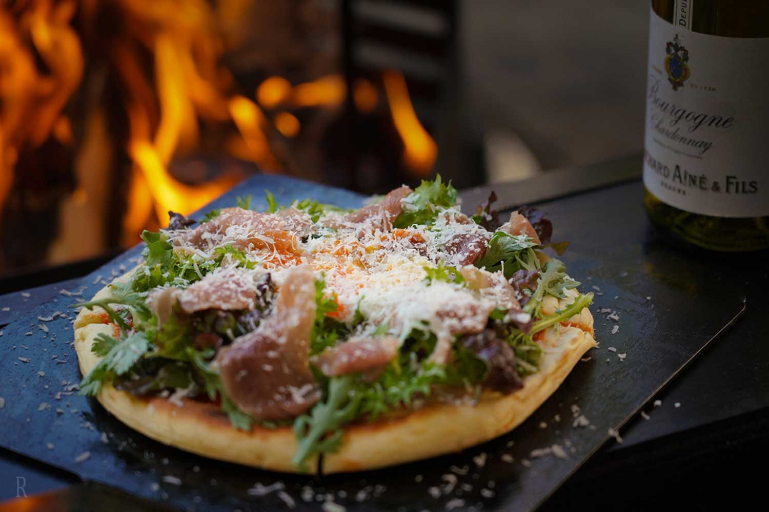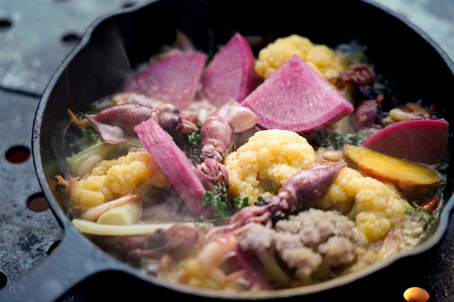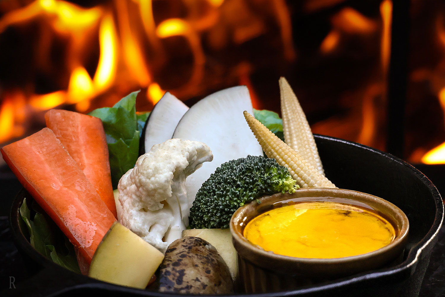 and aroma of meat and seafood brought out by a wood fire with all five senses.